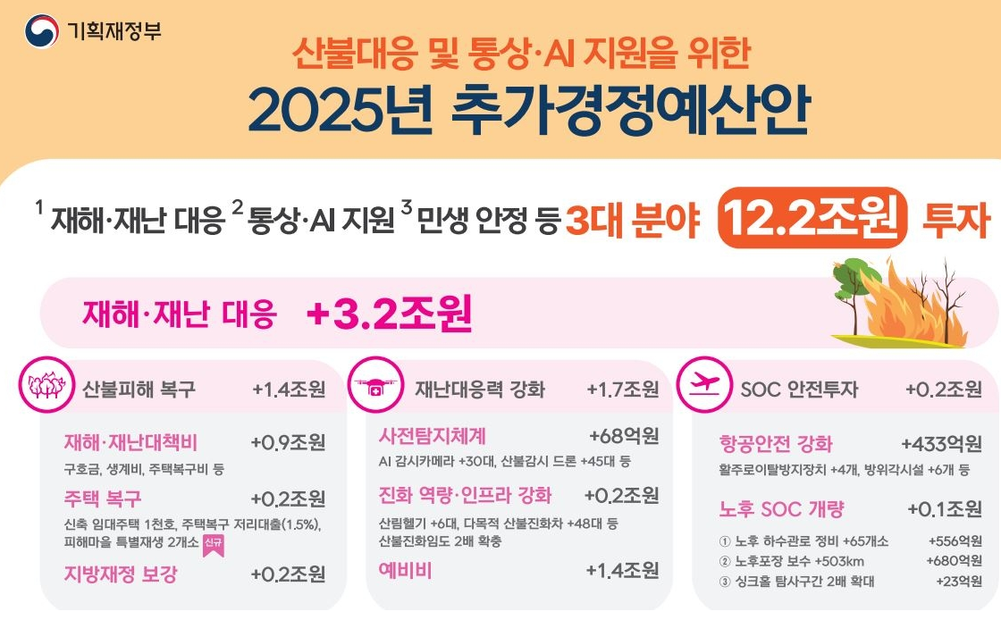 | 재난 복구 및 지역경제 지원 | 3조 원 | 침수·산불 피해 복구, 농어민 지원 등 |